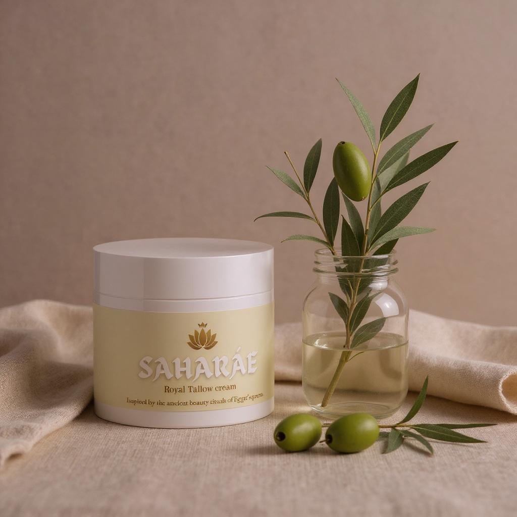 SAHARÁE revives that devotion, a tallow cream of pure grass-fed origin, infused with olive, jojoba, lavender, and lemongrass.